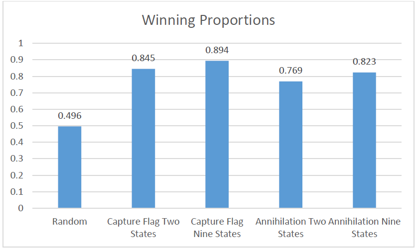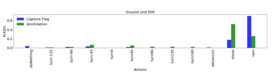根据附录中的公式A-1定义,与图4和图5中的行动频率类似。然后我们将这个分布实现在两个简单的人工智能Agent中,并与两个随机Agent进行比赛。作为一个基线性能,我们与两个随机Agent进行了比较。在这两种情况下,都进行了1000场比赛,并计算了获胜百分比。通过使用双状态概率分布,简单的人工智能Agent能够在夺旗游戏中赢得84.5%的时间,在歼灭游戏中赢得76.9%的时间。