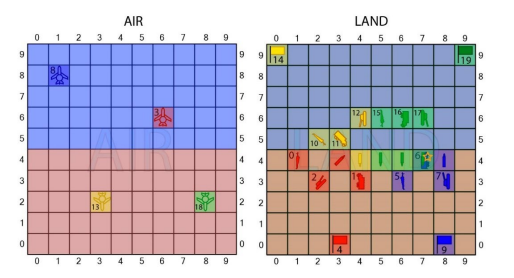 为了实现这些解决方案,我们开发了一个类似于国际象棋的棋盘游戏,由两支队伍组成,一支红色部队和一支蓝色部队,每支队伍可以有多个联盟(玩家)。游戏是在一个共同的战斗空间上进行的,这个战斗空间目前被设计为MDO每个领域的一套棋盘。图3显示了一组游戏棋盘的例子,我们考虑了一个"空中"和一个"陆地"棋盘。每个棋盘都被划分为一组单元格,"空中"棋盘被放在"陆地"棋盘上,形成一个共同的战斗空间。在这个例子中,我们选择了创建方形网格,并且只考虑两个领域。然而,在一般情况下,棋盘格可以采取任何形状,并且可以任意缩小,而棋盘的数量可以灵活处理MDO中的每一个域。例如,"空中"盘可以由多个代表不同海拔高度的板组成。这种提法提供了一个通用的应用编程接口(API),允许在兵棋推演中取得基本的研究进展,因为它可以被定制以适应任何兵棋推演的场景。