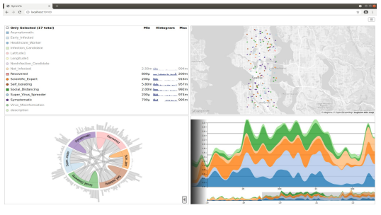 图16显示了SyncVis视觉分析系统,该系统旨在显示多个协调的数据分析视图,支持数据探索和理解。SyncVis通过用户互动将每个视图中显示的信息与其他视图联系起来,从而产生多种数据可视化。这个例子显示了SyncVis在四个协调视图中对COVID分类人群数据分析的二维界面。变量选择器(选择六个属性)、地图/地形、相互信息图和每个选定变量的叠加区域图。