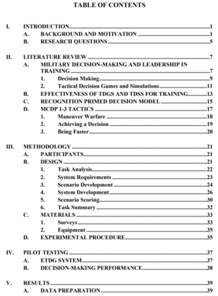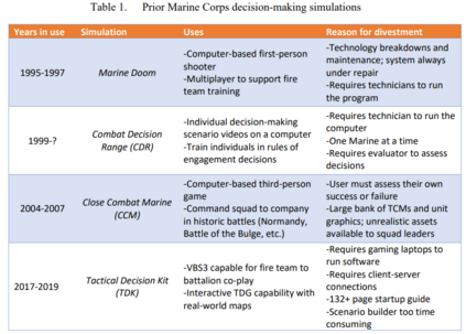美海军陆战队长期以来一直使用战术决策游戏(TDG)来训练和评估领导和决策能力。使用纸笔或干擦板的陈旧过程需要一个主题专家在场,以评估和评价每个海军陆战队员的演习计划,并对他们的演习计划提供即时反馈。这个过程很耗时,而且不允许海军陆战队员进行必要的演练和集训,以建立他们在各种情况下的直觉决策并获得经验。无论任务如何,海军陆战队要求领导者在战斗中取得成功,要做好准备,即使是在第一次遇到这种情况时也要采取行动。