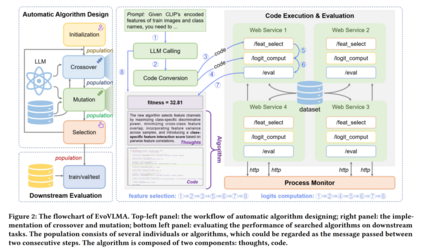 预训练的视觉-语言模型(Vision-Language Models, VLMs)已被广泛应用于各类计算机视觉任务(如小样本识别),通常通过模型自适应技术(如 prompt tuning 和 adapter)来实现。然而,现有的自适应方法大多由人类专家设计,既耗时又依赖经验。受近期大语言模型(Large Language Models, LLMs)在代码生成方面进展的启发,我们提出了一种进化式视觉-语言模型自适应方法(Evolutionary Vision-Language Model Adaptation, EvoVLMA),用于自动搜索免训练的高效 VLM 自适应算法。 我们将特征选择与logits 计算识别为免训练 VLM 自适应中的关键功能模块,并提出了一种基于大语言模型辅助的两阶段进化算法,按序优化这两个部分。该方法通过“分而治之”的策略,有效应对了庞大搜索空间带来的挑战。 此外,为了提高搜索过程的稳定性与效率,我们引入了低精度代码转换、基于 Web 的代码执行机制和过程监控机制,共同构建出一个高效的自动算法设计系统。大量实验表明,EvoVLMA 所发现的算法在性能上优于以往的手工设计方法。例如,在 8-shot 图像分类设置下,经典的 APE 算法在识别准确率上可提升 1.91 个百分点。 本研究为预训练多模态模型的自适应算法优化自动化开辟了新的可能性。项目代码已开源,地址为: https://github.com/kding1225/EvoVLMA