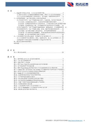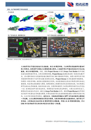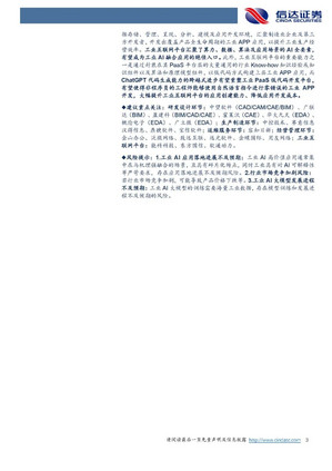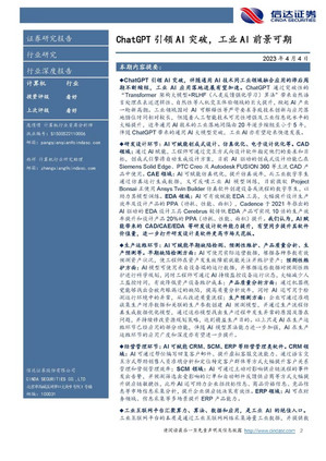 研发设计环节:AI可赋能创成式设计、仿真优化、电子设计优化等。CAD领域:通过AI赋能,工程师可通过交互方式向设计软件指定他们的要求和目标,创成式引擎将自动生成设计方案,目前AI驱动的创成式设计功能已在Siemens Solid Edge、PTC Creo及Autodesk FUSION 360等主流CAD产品中使用。CAE领域:AI可赋能仿真优化,提升仿真效率,而工业数字孪生通过仿真运行生成数据,又可反哺工业AI模型训练,目前微软ProjectBonsai正使用Ansys Twin Builder仿真软件创建设备或流程的数字孪生,以助力其模型训练。EDA领域:AI可有效赋能EDA工具,大幅提升设计生产效率及设计产品的PPA(功耗、性能、面积),Cadence于2021年推出的AI驱动的EDA设计工具Cerebrus较传统EDA产品可实现10倍的生产效率提升和设计产品20%的PPA(功耗、性能、面积)提升。我们认为,AI赋能带来的CAD/CAE/EDA等研发设计软件能力提升,有望同步提升其软件价值量,进一步打开研发设计类软件更高市场天花板。 生产运维环节:AI可赋能早期缺陷检测、预测性维护、产品质量分析、生产预测等。早期缺陷检测方面:AI可使用实际运营数据,根据各种参数有效预测资产状况,使工程师在资产发生故障前就能关注并维护资产;预测性维护方面:AI模型可使用来自设备端的运行数据,并根据这些数据对预测性维护进行科学规划,同时工程师可通过AI持续监控设备运行状态,大幅减少人工监控时间,有效降低资产设备维护成本;产品质量分析方面:通过机器视觉能够找出会被肉眼漏过的缺陷,提高质量分析效率,同时AI还可用于检测运行环境中的异常,从而改进质量流程;生产预测方面:企业可通过准确收集生产时序数据和关联的生产参数创建AI预测模型,并通过生产流程仿真生成数据优化模型,通过这些模型找出生产过程中发生异常的原因及潜在问题,并持续修改资源规划策略,达到精益生产目的。以上只是AI在生产运维环节已经应用的部分功能,伴随AI模型算法能力进一步加强,AI在生产运维环节的应用广度和深度亦有望进一步提升。 经营管理环节:AI可赋能CRM、SCM、ERP等经营管理类软件。CRM领域:AI可通过帮忙编写回复客户邮件、提升虚拟客服交流能力、通过语言交互方式帮助销售人员准确分析和定位特定客户群体等方式大幅提升客户关系管理和营销管理效率;SCM领域:AI可通过主动对影响供应链流程的事件发出告警,并预测筛选出受影响的订单和自动邮件反馈供应商等方式大幅提升供应链敏捷性,此外AI还可助力企业招投标信息、商品价格信息、竞品信息等市场信息采集分析,提升企业供应链决策有效性。ERP领域:AI可在财务领域、信息采集等多场景提升ERP产品能力。 工业互联网平台汇聚算力、算法、数据和应用,是工业AI的绝佳入口。工业互联网平台的本质是通过工业互联网网络采集海量工业数据,并提供数据存储、管理、呈现、分析、建模及应用开发环境,汇聚制造业企业及第三方开发者,开发出覆盖产品全生命周期的工业APP应用,以提升工业生产经营效率。工业互联网平台汇聚了算力、数据、算法及应用场景的AI全要素,有望成为工业AI融合应用的绝佳入口。此外,工业互联网平台的重要能力之一是通过封装在其PaaS平台层的大量通用的行业Know-how知识经验或知识组件以及算法和原理模型组件,以低代码方式构建上层工业APP应用,而ChatGPT代码生成能力的跨越式进步有望重塑工业PaaS低代码开发平台,有望使得非程序员的工程师能够使用自然语言指令进行零错误的工业APP开发,大幅提升工业互联网平台的应用创建能力、降低应用开发成本。