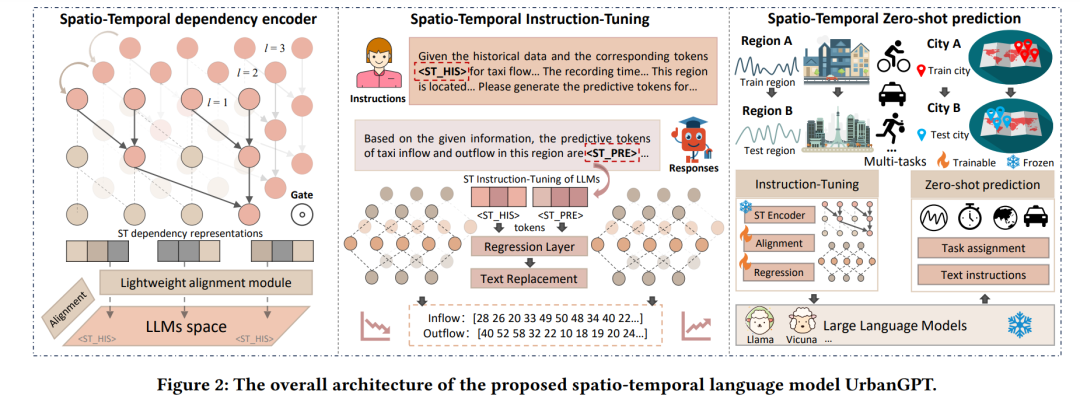 我们提出了UrbanGPT,一个时空预测框架,使大语言模型(LLMs)能够理解时间和空间之间的复杂依赖关系。这是通过将时空依赖编码器与指令微调范式无缝集成来实现的,有效地将时空上下文与LLMs对齐。