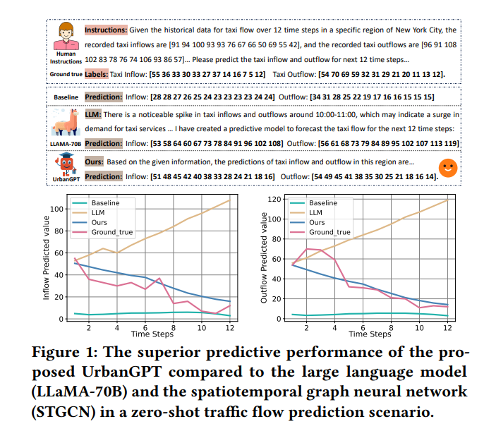 贡献:鉴于这些挑战,我们提出了UrbanGPT,一个专门为时空预测量身定制的大型语言模型。UrbanGPT的核心是一种新颖的时空指令微调范式,旨在将时间和空间的复杂依赖关系与LLMs的知识空间对齐。在我们的UrbanGPT框架内,我们首先引入了一个时空依赖编码器,该编码器利用多层次时间卷积网络,使模型能够捕捉到各种时间分辨率下时空数据中的复杂时间动态。然后,我们的模型涉及对齐文本和时空信息,以使语言模型能够有效注入时空上下文信号。这是通过利用一个轻量级对齐模块来实现的,该模块投影时空依赖关系的表示。通过整合文本和时空领域中的有价值信息,生成了更具表现力的语义表示。 在指令微调过程中加入时空信息,使语言模型在理解和处理时空数据中的复杂关系和模式方面变得更加熟练。通过利用从时空领域获得的见解,语言模型能够更好地捕捉时空现象的细微差别和复杂性。这反过来使模型即使在数据可用性有限的情况下,也能够在各种城市场景中做出更可靠和深入的预测。 为了展示我们提出的模型的优越预测性能,我们在图1中展示了在一个由文本指令引导的零样本交通流量预测场景中,将其与大型语言模型(LLaMA-70B)和时空图神经网络(STGCN)进行比较。大语言模型LLaMA能够有效地从输入文本中推断出交通模式。然而,它在处理具有复杂时空依赖性的数值时间序列数据时的局限性,有时可能导致相反的交通趋势预测。另一方面,预训练的基线模型在理解时空依赖性方面表现出色,但可能会因过拟合源数据集而在零样本场景中表现欠佳,表明其在现有时空预测模型之外的泛化能力有限。相比之下,我们提出的模型实现了领域特定时空知识和语言建模能力的和谐结合,使我们在数据稀缺情况下做出更准确和可靠的预测。