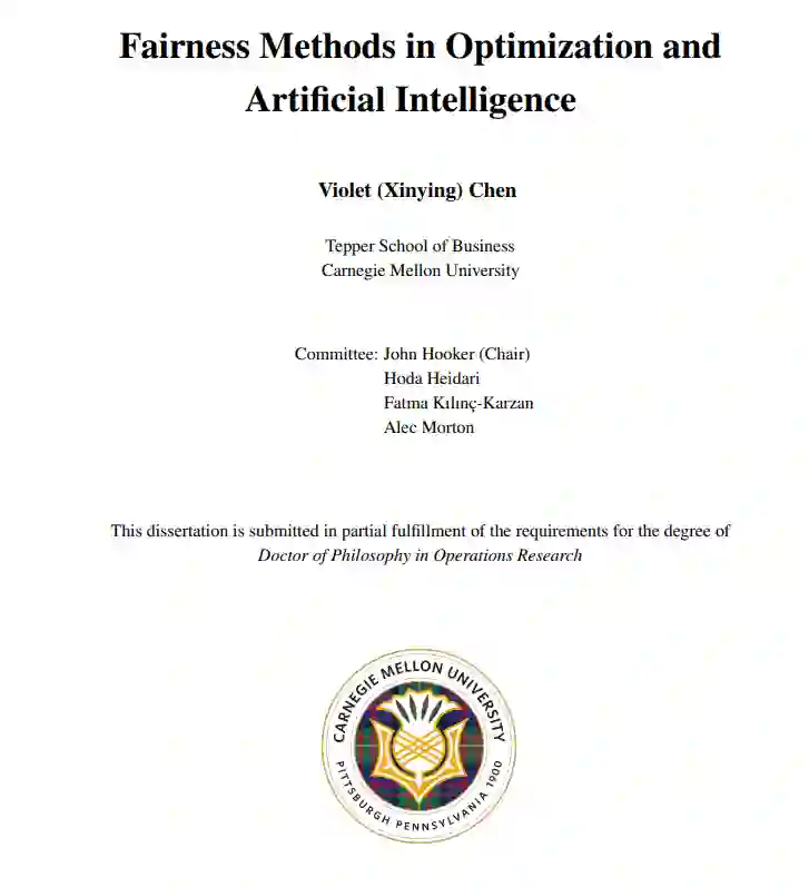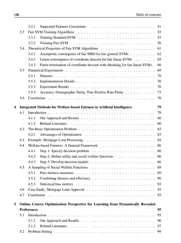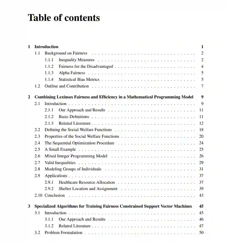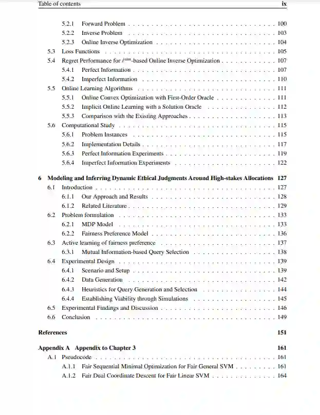 随着越来越多的优化和人工智能(AI)方法用于辅助高风险的现实生活决策,公平已经成为这些工具的设计者和用户考虑的一个基本因素。本文研究的是制定、实现和引出公平的新途径。第一章通过优化模型研究公平与效率的平衡。我们提出新的社会福利函数(SWFs)作为罗尔斯法则公平性和功利主义两大著名标准的综合衡量。然后,我们设计了一个程序,用混合整数/线性规划模型顺序地最大化这些SWFs,以找到社会最优解。该方法具有广泛的资源分配应用的实际潜力,并在医疗保健提供和灾害准备避难所分配的实际规模应用中得到了证明。第二章考虑了一个由公平机器学习驱动的优化任务。在开发公平的ML算法时,了解公平的计算代价与标准的不公平设置相比是很有用的。对于利用优化模型进行训练的公平ML方法,专门的优化算法可能比通用求解器提供更好的计算性能。在本章中,我将探讨支持向量机(SVM)的这个问题,并设计块坐标下降型算法来训练包含线性公平性约束的SVM。数值实验表明,在训练公平支持向量机方面,新的专门算法比现成的求解器更有效。