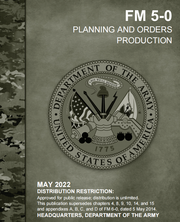 FM5-0《规划和指令的制定》是陆军计划的综合参考手册。它概述了规划的基本原理,并详细介绍了规划行动的各种方法。它是陆军解决问题、军事决策过程、部队领导程序、评估规划以及陆军规划和指令格式的理论来源。