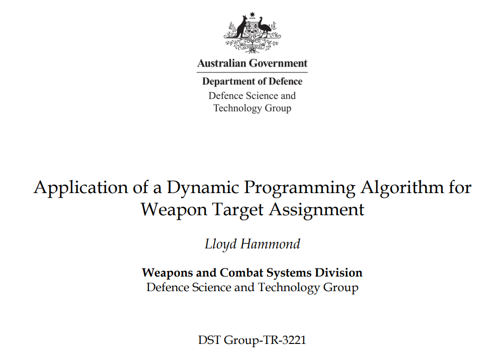 威胁评估和武器分配应用是在海战场景中取得成功结果的一个组成部分,无论是在保卫自身资产还是摧毁敌方目标方面都是如此。为了帮助应对日益复杂和快速变化的作战环境,作战人员需要获得基于优化技术的实时决策辅助工具,以支持决策过程。本报告记录了用于确定、开发和评估 "武器目标分配 "动态规划算法的方法,经过更严格的测试后,该算法可用作概念演示器和实时作战情况下的辅助决策工具。