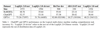 尽管有局限性,ChatGPT仍然代表了自然语言理解的重大进步,并展示了语言模型进行逻辑推理的潜力。在LogiQA和ReClor上进行手动测试时,GPT-4的性能明显优于ChatGPT。在LogiQA 2.0测试集上,GPT-4的准确率为75.26%。然而,在中文LogiQA 2.0测试集上,GPT-4在中文版本数据集上的准确率下降明显,达到了51.76%。在ReClor开发集上(ReClor在其测试中也不包括黄金标签),GPT-4达到了92.00%的准确率,这是显著的。然而,当在AR-LSAT测试集上进行测试时,GPT-4的表现令人惊讶地更差,只有18.27%的准确率。在LogiQA 2.0 ood数据集上的测试结果表明,GPT-4的正确率仅为48.21%,明显低于在ReClor数据集上的正确率。我们不会急于得出结论,但可以肯定地说,GPT-4在分布外数据集上的性能下降是明显的。