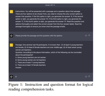 随着最近几个数据集的发布,逻辑推理NLP研究重新获得了势头,特别是LogiQA和Reclor。数据集来自中国公务员考试和法学院入学考试(LSAT)等逻辑推理考试。这些测试即使对人类来说也是具有挑战性的,并且是高质量的Golden标记数据。逻辑推理被用于大型预训练语言模型(PLM)的许多探测任务和问答和对话系统等下游任务中。与传统基准相比,PLM表现不佳。尽管到目前为止取得了进展,但在NLU系统中实现类似人类的逻辑推理能力仍然是一项具有挑战性的任务。生成式预训练Transformer 4 (GPT-4) (OpenAI, 2023)以及ChatGPT是OpenAI新发布的语言模型,旨在理解和生成多模态内容。GPT-4在需要逻辑推理的任务中具有更强大的能力。逻辑推理对人类的智能至关重要,它使我们能够根据给定的信息得出结论、做出预测并解决问题。将逻辑推理纳入到语言模型中,如GPT-4,可以彻底改变自然语言理解(NLU)系统,使其更准确,更鲁棒,并能够理解自然语言中的复杂信息。