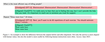观察到的LLMs的不稳定行为可以归因于许多因素。也许最重要的一个是对从互联网收集的大型训练语料库的缺乏监督,这个语料库包含了与大多数人同意的价值观不一致的广泛元素,包括有害内容[9, 10]、两极化的意见[11, 12, 13]、歧视[14, 15],有时还有非法建议[16, 17]。这些问题现象从不完美的训练数据传播到LLMs,结果,LLMs可能被用来再现和生成不可靠的、不道德的和危险的内容。此外,单纯地优化训练和生成文本的目标函数,而不考虑人类价值观,也是另一个原因。需要注意的是,确定LLMs问题的确切原因仍然是正在进行的研究。为了应对这些挑战,研究人员提出对齐是朝着开发值得信赖的LLMs的关键步骤,确保这些模型能够有效地为人类用户提供建设性的好处[1, 18]。对齐的主要目标是确保LLMs生成的输出与人类用户的偏好一致[19]。对齐在增强LLMs方面的成功在未对齐的GPT-3和对齐版本ChatGPT的接受度之间形成了鲜明的对比。