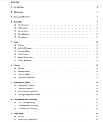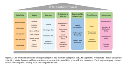 然而,尽管对齐是LLMs受欢迎的核心技术,但评估这些模型中对齐的程度以及设计适当的对齐任务仍然是尚未解决的挑战,目前没有明确和有原则的指导可供参考。特别地,缺乏既定和统一的讨论,涵盖使LLMs值得信赖的全方位对齐。现有的文献提出了多种对齐任务的考虑因素,其中一个值得注意的一般指导原则是“HHH" 原则[20],主张对齐应该是有帮助的、诚实的和无害的。此外,[21]中提出了一个与构建LLMs相关的风险分类,包括六个风险:(1) 歧视、排斥和有毒性,(2) 信息危害,(3) 虚假信息危害,(4) 恶意使用,(5) 人机交互危害,以及(6) 自动化、访问和环境危害。虽然这个分类提供了相关问题的全面覆盖,但它可以进一步解开每一个维度。