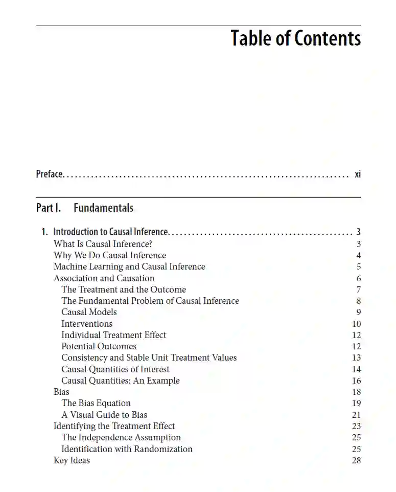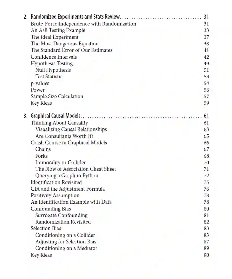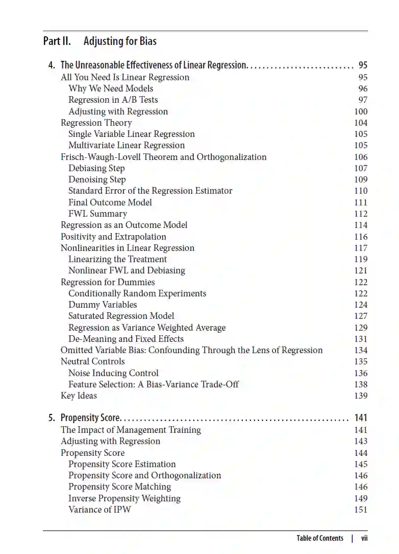 第一部分介绍了关于因果推断的基础概念。第一章介绍了您在推理削减价格的效果时所用的因果推断的关键概念。第二章讨论了A/B测试(或随机对照试验)的重要性,不仅作为决策的工具,还作为您将用来评估其他因果推断工具的黄金标准。这也是复习一些统计概念的好机会。第三章主要是理论性的,涵盖了因果识别和图形模型,这是一种用于(字面上)绘制您对因果过程的假设并推理您需要做什么来区分关联和因果关系的强大方法。完成第一部分后,您应该具备从因果推断角度思考的基本基础。 在第二部分,您将被介绍到两个用于区分因果关系和相关性的主要工具:线性回归和倾向性加权。第四章涵盖了线性回归,但不是从大多数数据科学家熟悉的角度。相反,您将学习一种重要的偏差移除技术:正交化。第五章涵盖了倾向得分和双重稳健估计。 第三部分将第二部分的内容与机器学习和大数据结合在一起。您将研究因果推断作为个性化决策工具。通过食品配送服务的视角,您将尝试理解哪些顾客应该得到折扣券以获得他们的忠诚,哪些顾客不需要额外的激励。在第六章,您将进入异质处理效应的世界。第七章深入了解机器学习和因果推断交叉点的一些最新发展。在这一章,您将学习T-、X-和S-学习者以及双重/去偏机器学习等方法,都是在处理个性化的背景下。 第四部分为因果推断增加了时间维度。在某些情况下,您会有同一客户或市场在多个时间段的记录,这构成了所谓的面板数据集。您将学习如何利用面板来揭示付费市场营销的真正影响,即使无法随机决定谁能看到您的广告。第八章将引导您了解差分法,包括这一文献中的一些最新发展。第九章将涵盖合成控制(及其变体),也是在理解市场营销活动的影响的背景下。 最后,第五部分深入探讨了替代实验设计,用于随机化不可行时。第十章将涵盖地理实验,目标是找到待处理地区和作为对照的地区,以及切换实验,用于您的分析单位很少并且希望通过打开和关闭同一单位的处理来找出处理效果时。第十一章深入研究了不合规实验,并向您介绍了工具变量(IV)。它还简要涵盖了不连续设计。