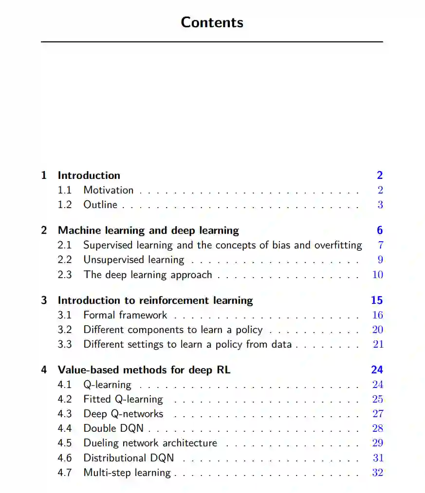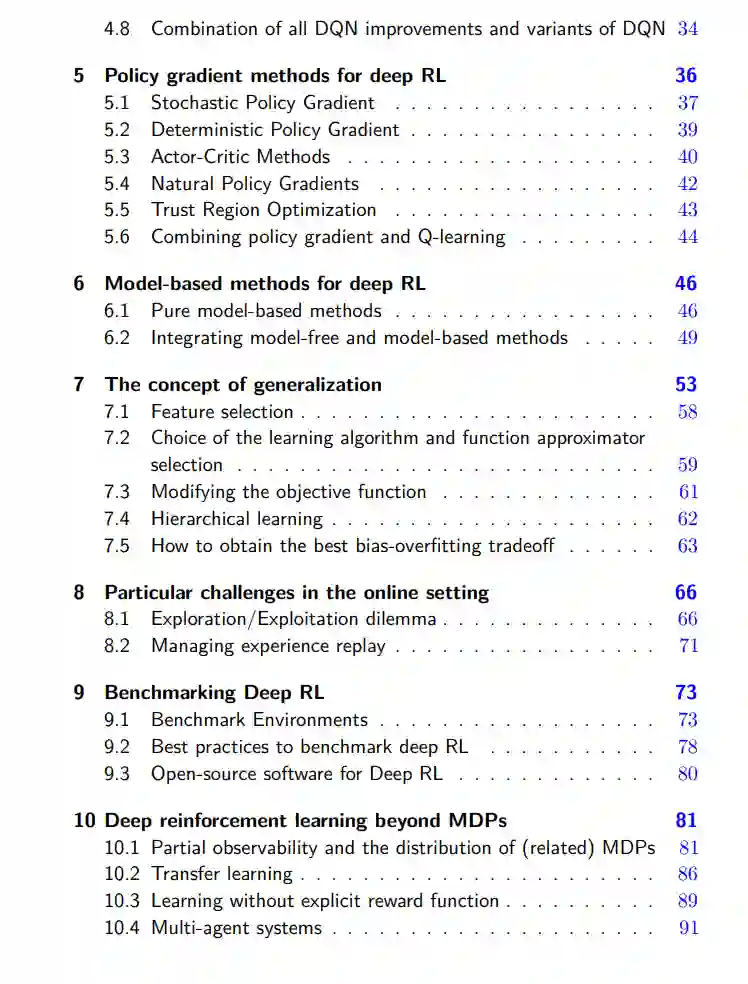 近年来,由于其在解决具有挑战性的顺序决策问题中的成功,RL变得越来越受欢迎。其中,多项成果归功于与深度学习技术(LeCun等,2015;Schmidhuber,2015;Goodfellow等,2016)的结合。这种结合,称为深度RL,对于具有高维状态空间的问题最为有用。以前的RL方法在特征选择上有一个困难的设计问题(Munos和Moore,2002;Bellemare等,2013)。然而,深度RL在需要较低先验知识的复杂任务中表现出色,这归功于其从数据中学习不同级别的抽象的能力。例如,深度RL代理可以成功地从由数千个像素组成的视觉感知输入中学习(Mnih等,2015)。这为模仿某些人类的问题解决能力打开了可能性,即使在高维空间中 —— 这在几年前还很难想象。