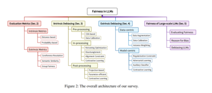 根据训练范式,LLMs可以分为预训练和微调范式,以及提示范式。在预训练和微调范式中,LLMs的参数少于十亿个,并且易于调整,例如BERT和RoBERTA(Liu等,2019年),我们称之为中等规模的LLMs。中等规模LLMs中的偏见可以大致分为两种类型:内在偏见和外在偏见(Goldfarb-Tarrant等,2021年),如图1所示。内在偏见对应于LLM编码的嵌入中的偏见,并反映了模型输出表示的公平性。外在偏见对应于下游任务的决策偏见,并反映了模型预测的公平性。在提示范式中,LLMs的参数超过十亿个,并且基于提示进行调整或不调整,例如GPT-4(OpenAI,2023年)和LLaMA-2(Touvron等,2023b年),我们称之为大规模的LLMs。大规模LLMs中的偏见通常在给定特定提示时体现在模型输出中。在本文中,我们对LLMs中的公平性相关研究进行了全面的回顾,总体架构如图2所示。重点关注预训练和微调范式下的中等规模LLMs,我们在第2节介绍了评估指标,在第3节和第4节分别介绍了内在去偏见方法和外在去偏见方法。在第5节中,提供了提示范式下大规模LLMs的公平性,包括公平性评估、偏见原因和去偏见方法。我们还在第6节中讨论了当前面临的挑战和未来发展方向。