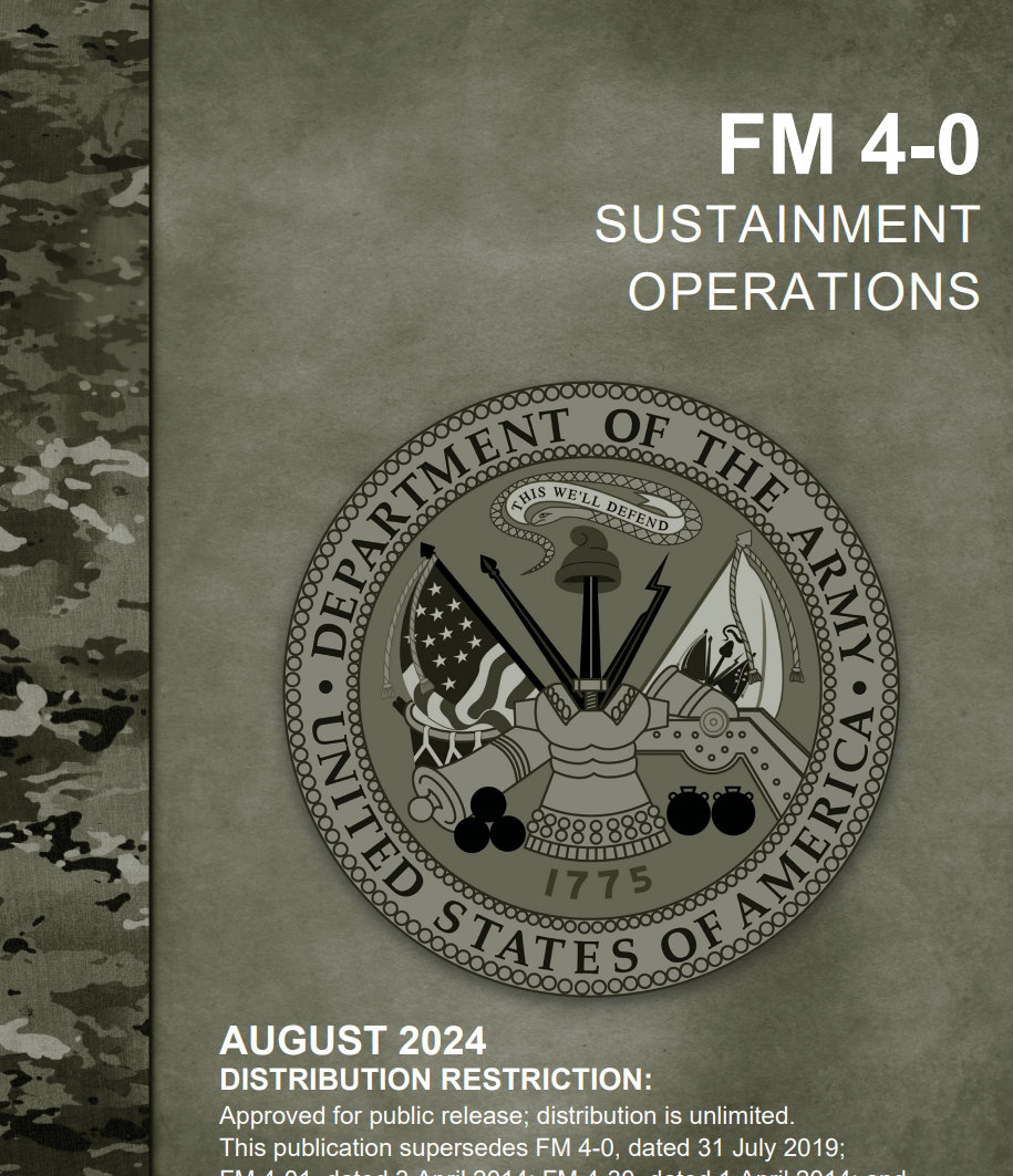 2022 年 10 月出版的 FM 3-0 将多域作战编纂为陆军的作战概念。FM 4-0 描述了支持陆军作战概念的持续作战行动,以及陆军如何支持联合部队执行战役。它是陆军在战区战略、作战和战术层面的持续作战行动的条令。该出版物强调持续作战的基本原理和战术,使所有指挥官、参谋人员和士兵了解持续作战行动。FM 4-0 的内容与 ADP 4-0 中包含的主要维持条令一致,是陆军所有维持行动的条令基础。FM 4-0 描述了陆军及其组织如何开展持续作战行动,是陆军技术出版物(包括 ATP 4-91、ATP 4-92 和 ATP 4-93)中强化的主要陆军条令。