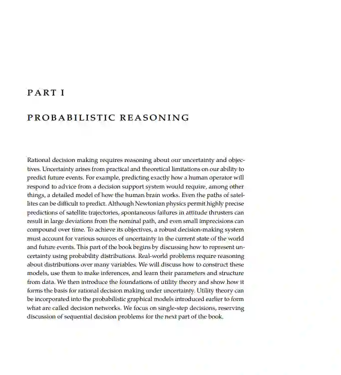 本书分为五个部分。第一部分讨论了在单一时间点的简单决策中对不确定性和目标进行推理的问题。第二部分将决策扩展到顺序问题,在这个问题上,我们必须根据我们行动的结果的信息做出一连串的决定,随着我们的行动进行。第三种是针对模型的不确定性,即我们不是从一个已知的模型开始,必须通过与环境的互动来学习如何行动。第四部分讨论了状态的不确定性,不完善的感知信息使我们无法了解完整的环境状态。最后一部分讨论了涉及多个智能体的决策环境。