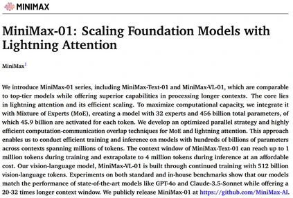 MiniMax 开源了最新的基础语言模型 MiniMax-Text-01 和视觉多模态模型 MiniMax-VL-01。 新模型的最大亮点是,在业内首次大规模实现了新的线性注意力机制,这使得输入的上下文窗口大大变长:一次可处理 400 万 token,是其他模型的 20-32 倍。 他们相信,这些模型能够给接下来一年潜在 Agent 相关应用的爆发做出贡献。 为什么这项工作对于 Agent 如此重要? 随着 Agent 进入应用场景,无论是单个 Agent 工作时产生的记忆,还是多个 Agent 协作所产生的 context,都会对模型的长上下文窗口提出更多需求。