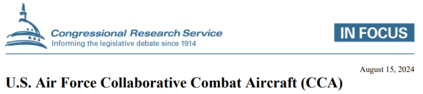 众议院军事委员会在其关于 2025 财年国防授权法案的报告 H.Rept. 118- 529)中指示空军利用现有推进系统进行 CCA 开发,以最大限度地提高可负担性和降低风险。同一份报告要求通报空军和海军将模块化开放系统架构标准纳入 CCA 要求的计划。