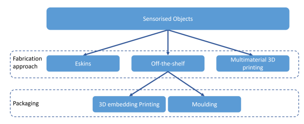 目前,有三种主要的途径来开发智能和传感器化设备。第一条是使用Eskin方法开发触觉传感器,这涉及到通常昂贵的工艺和专用设备的制造。第二种是购买现成的传感器,并按原样使用,或使用3D打印或模塑将其封装。最后,第三种方法是在现有的基材上3D打印设备,并使用滴塑等方法对其进行封装。图1.1介绍了目前的方法。