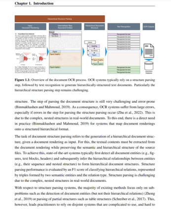 在工业、研究和公共部门,信息通常存储为已呈现的文档(例如PDF文件、扫描件)。因此,为了实现下游任务,需要系统将这些呈现的文档映射到具有层次结构的文本文档上。用于此任务的现代光学字符识别(OCR)系统通常基于解析层次文档结构和文本识别的两个单独阶段。由于一系列的挑战,之前缺少对文档完整层次结构的整体、原则性的推断方法。一个主要的挑战是由结构解析任务的复杂性给出的,该任务包括检测所有语义文档实体(例如,表格、文本和图形)以及描述它们的层次嵌套和阅读顺序的实体之间的关系。此外,系统组件中不连续的设置和使用启发式方法妨碍了在实际场景中的训练、应用和适应。另外,为基于学习的系统注解训练样本非常耗时且昂贵。在这篇论文中,我们通过构建可扩展的系统来解决这些问题,这些系统允许统一的端到端文档解析和光学字符识别。具体来说,这篇论文提供了以下贡献: