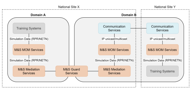 图10提供了一个跨域信息交换的简化模式。M&S调解服务将数据转换为M&S防护服务可以解释的格式。M&S调解服务和M&S防护服务之间的接口是特定的解决方案,但通常涉及XML或纯文本格式的消息,供M&S防护服务检查和过滤。M&S防护服务的实施大多是国家(机密)和专有的解决方案,并且由于与模拟数据的延迟和吞吐量有关的M&S要求,被认为是M&S特定的。训练系统位于国家站点,在这个例子中是X站点和Y站点,通信服务(如CFBL-Net)提供跨站点的IP单播/多播网络服务。此外,加密设备(如果使用,未在图中显示)确保站点之间的数据通信是加密的。