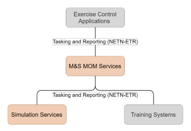 图8展示了一个演习控制模式,模拟实体由演习控制应用发出任务。M&S MOM服务在模拟服务和训练系统之间分配任务,对于演习控制应用来说,模拟实体所在的位置是透明的,因此哪个组件有建模的责任。AMSP-04 NETN-ETR是战争领域中模拟实体任务和报告的标准。
