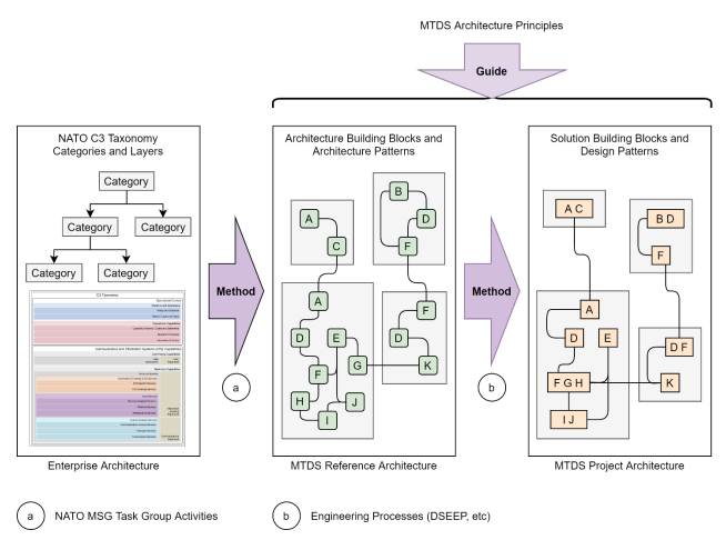 架构原则指导MTDS参考架构和MTDS项目架构的开发、维护和使用过程。原则是持久性的一般规则和指导方针,告知并支持北约和伙伴国家如何完成任务。在图2中,"指南 "箭头说明了这一点。