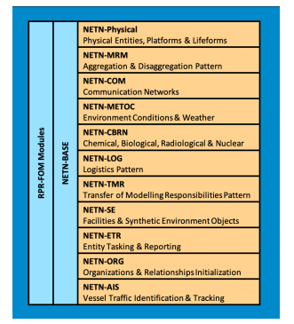 M&S面向消息的中间件(MOM)服务。这些服务使M&S和CTE应用程序和服务以及培训系统具有互操作性。面向消息的中间件服务符合NATO STANAG 4603和NATO标准AMSP-04。NATO STANAG 4603规定使用IEEE 1516™-2010 (HLA Evolved)标准,用于分布式仿真环境的高层架构。AMSP-04(NETN)定义了一套(连贯的)HLA FOM模块,以及架构和设计指南,见图7。NETN的FOM模块旨在最大限度地提高仿真组件之间的重复使用和互操作性。