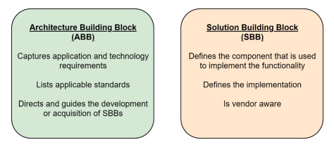 架构模块(ABB)和架构模式(AP)这两个概念被用来描述RA中的模块以及这些模块如何被组合。这些概念在图3和图4中得到了说明,其中第一个图还显示了作为对比的概念--解决方案模块(SBB)。