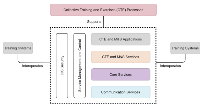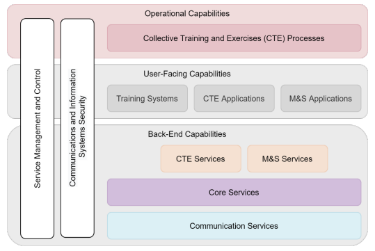 这一层包含了训练系统,以及用于支持合成集体训练的M&S和CTE应用。这些是用户与之互动的应用,因此是 "面向用户的"。