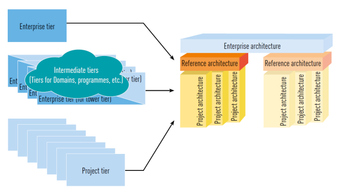 架构可以在不同的抽象层次上进行设计,人们可以区分不同类型的架构。一般来说,对各种抽象层次或如何命名它们没有什么共识。例如,北约架构框架(NAF)[2]提到了不同种类的架构和导致这些架构的活动。架构的不同种类或类型如图1所示。