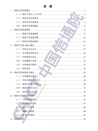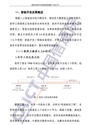 2024年《政府工作报告》首次提出“人工智能+”战略行动,旨在推动人工智能赋能各行各业。以大模型为代表的新一代人工智能技术迅猛发展,已成为软件工程领域智能化转型的关键驱动力,为软件开发、测试等环节注入新智力。智能化软件开发工具凭借其强大的代码理解和生成能力,有效降低了开发人员的技术门槛,并提高开发效率和质量,进一步推动软件开发领域的进步。 然而,在软件开发的智能化能力建设和应用过程中,仍面临诸多挑战,如代码大模型选择困难、开发工具的工程化建设复杂、智能化能力建设无参考、开发场景选择和落地难,以及与现有开发工具或流水线的集成难等问题。为此,本指南旨在为正在进行软件开发智能化转型的企业提供一份实用指南,为企业制定落地策略、建设智能开发能力体系提供有力参考。本指南系统梳理了智能化软件开发的发展历程、现状和面临的挑战,结合大模型和软件开发特点,提出了具体的落地方向、路径和框架,详细阐述了落地所需的核心能力和使能能力,并对多个行业的落地案例进行了深入剖析,最后对智能化软件开发的发展趋势进行了展望。 由于大模型等人工智能技术产业仍处于快速发展阶段,智能开发相关的技术产品、服务和应用也在不断演变,我们的认识将随着产业实践而不断深化,报告存在的不足之处,恳请大家批评指正。 智能开发发展概述 随着人工智能技术的不断进步,特别是大模型能力的持续提升,软件工程领域正迎来前所未有的变革,软件开发的流程和模式正被重新定义,智能化进程显著加速。本章将简要回顾软件工程的发展历程,重点介绍软件工程3.0的发展特点,以及智能化软件开发(以下简称:智能开发)领域发展现状,并深入探讨智能化能力为软件开发带来的价值提升,最后梳理落地挑战。 软件工程步入3.0时代 软件工程发展历程 软件工程自1968年诞生以来,其发展历程可分成三个阶段,包括软件工程1.0、软件工程2.0和软件工程3.0。