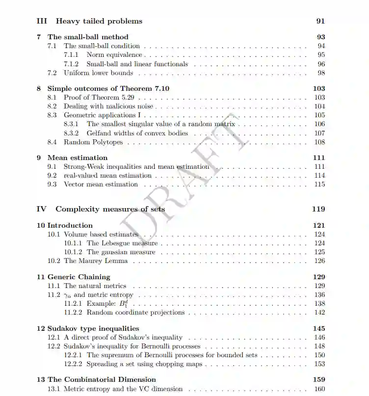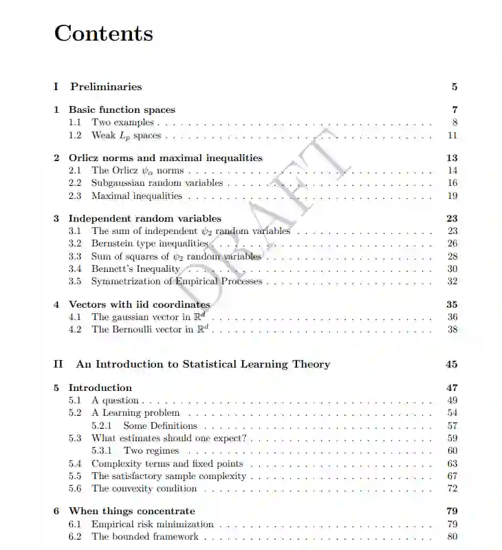 几何在现代统计学习理论中扮演着重要的角色,在这个快速发展的领域中可以发现几何的许多不同方面。本文对其中的一些方面进行了阐述。这些笔记的基本主题是结构,特别是使用随机性来暴露集合中的隐藏结构的方式。渐近几何分析是研究凸集的研究领域,利用随机性揭示结构是其核心思想之一。不太为人所知的是,随机性和结构之间的联系是统计学习理论的核心。统计学习理论和更一般的非参数统计学都专注于预测和估计问题。粗略地说,随机样本是通过(明智地)从给定的函数类中选择一个函数来生成未知随机变量的近似值。由于给定数据的性质,随机性显然在学习问题中发挥着重要作用,但将其与“结构”联系起来在这一点上似乎有点牵强。