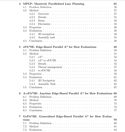 与所有懒惰搜索算法一样,MPLP假设后继状态可以在不评估边的情况下生成,从而使算法能够推迟边的评估并懒惰地进行搜索。然而,这个假设并不总是成立,例如,在使用计算量很大的模拟器生成后继状态的仿真规划中。为此,我们的第二个贡献是针对慢速评估的基于边的并行A*(ePA*SE),它在保证最优性的同时,将规划与边的并行评估交织进行。我们还提出了其有界次优变体,用规划速度换取最优性。