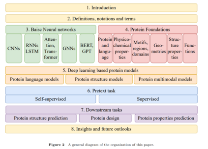 在以下部分中,我们提供了定义、常用术语和解释了在蛋白质研究中使用的各种深度学习架构。这些架构包括卷积神经网络(CNN)、循环神经网络(RNN)、变压器模型和图神经网络(GNN)。尽管深度学习模型在蛋白质研究领域的应用日益增加,但仍需要对这个快速发展的领域进行系统总结。现有的与蛋白质研究相关的综述主要关注生物学应用[25-27],而没有更深入地探讨其他重要方面,例如比较不同的预训练蛋白质模型。我们探讨了这些架构如何被适应用作蛋白质模型,总结并对比了用于学习蛋白质序列、结构和功能的模型架构。此外,还讨论了为蛋白质相关任务优化的模型,例如PSP、蛋白质-蛋白质相互作用(PPI)预测和蛋白质性质预测,突出显示了它们的创新和差异。此外,还提供了一系列资源,包括深度蛋白质方法、预训练数据库和论文列表[1][2]。最后,本综述介绍了现有方法的局限性和未解决的问题,并提出了可能的未来研究方向。图2展示了本文组织的概览。