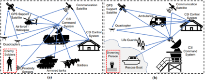 图1. C3I系统在(a)军事行动和(b)救援任务中的应用演示。