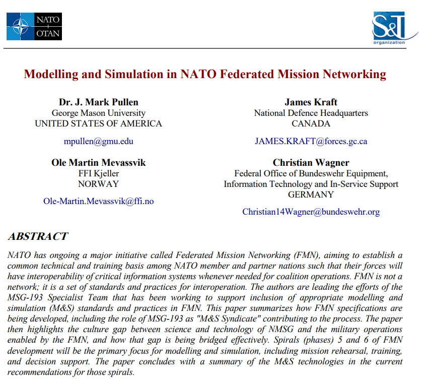 北约正在进行一项名为联邦任务网络(FMN)的重大举措,旨在在北约成员国和伙伴国家之间建立一个共同的技术和培训基础,以便在联盟行动需要时,他们的部队能够对关键信息系统进行互操作。FMN不是网络;它是一套互操作的标准和实践。作者正在领导MSG-193专家团队的工作,该团队一直致力于支持在FMN中纳入适当的建模和仿真 (M&S) 标准和实践。本文总结了FMN规范是如何制定的,包括MSG-193作为“M&S辛迪加”在过程中的作用。然后,该论文强调了NMSG的科学技术与FMN支持的军事行动之间的文化差距,以及如何有效弥合这种差距。FMN开发的第5和第6螺旋(阶段)将是建模和仿真的主要重点,包括任务演练、培训和决策支持。本文最后总结了当前针对这些螺旋的建议中的M&S技术。