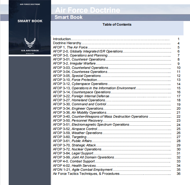 条令智慧书的第一部分提供了空军的顶点和作战条令结构。条令智慧书的第二部分包括每份经批准的空军条令出版物(AFDP)及其与联合出版物(JP)关系的概要。空军的顶点条令出版物,AFDP1《空军》,由空军参谋长签署。《作战条令》则由勒梅中心指挥官签署。