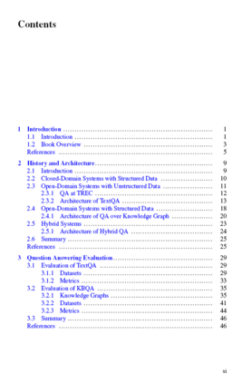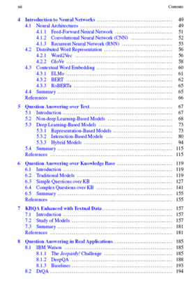 在第一章对本书进行了概览和介绍之后,第二章将解释QA系统的历史和不同QA方法的体系结构。它从早期的近域QA系统开始,并回顾了不同代的QA直到最先进的混合模型。接下来,第三章专门解释用于评估TextQA和KBQA的数据集和指标。第四章介绍了用于质量保证系统的神经模型和深度学习模型。本章包括深度学习和神经文本表示模型的必要知识,以理解文本上的QA模型和知识库上的QA模型,分别在第5章和第6章中解释。在一些KBQA模型中,文本数据还被用作知识库之外的另一个来源;这些混合模型将在第7章进行研究。在第8章中,详细解释了一些著名的QA系统的实际应用。最后,我们将在第9章中讨论有待解决的问题和QA的未来工作。