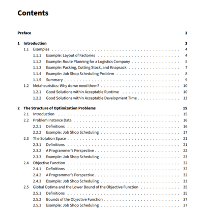很久以前,我在读博士期间写了《全局优化算法-理论和应用》[203],现在我想写一本更实用的优化和元启发式指南。目前,这本书处于开发和制作的早期阶段,因此预计会有很多变化。本文试图介绍优化以一种无障碍的方式为观众的本科生和研究生没有背景的领域。它试图提供关于优化算法在实践中如何工作的直觉,解决问题时要寻找什么东西,以及如何从简单、有效的“概念证明”方法获得给定问题的有效解决方案。我们遵循“边做边学”的方法,通过尝试解决一个实际的优化问题作为贯穿全书的示例主题。所有的算法在引入后都直接实现并应用于该问题。这让我们可以根据实际结果讨论他们的优势和劣势。我们学习如何比较不同算法的性能。我们尝试逐步改进算法,从非常简单的、效果不佳的方法转向高效的元启发式方法。