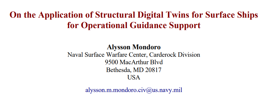 自 2000 年初以来,数字孪生的概念已成为从结构工程到生物医学工程等各行各业使用的关键技术。就海军和海洋结构而言,数字孪生技术在船舶安全高效运行、船舶和船队优化维护、船舶优化航线规划等方面的应用潜力得到了讨论(VanDerHorn 和 Mahadevan,2021 年;Drazen 等人,2019 年;Glaessgen,2012 年)。技术合作计划(TTCP)数字孪生兴趣社区(CoI)最近开展的研究讨论了这一概念,目的是了解数字孪生在运营支持、优化和优先安排船队维护、基于平台健康的长期航线规划以及预后和预测性健康监测方面的用例。CoI 对与数字孪生相关的能力、优势、问题和风险进行了审查和总结(Woolley et al 2023)。讨论的用途之一是(近)实时运行支持和结构数字孪生(SDT)。本文将进一步探讨 SDT 的设计,以提供(近)实时支持。