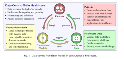 基础模型(FMs)的崛起在视觉识别[131, 211, 218]、语言理解[24, 59, 193, 194]和知识发现[21, 201]等领域引发了一系列突破。在计算医疗[3, 72]领域,FMs能够处理各种临床数据,其在逻辑推理和语义理解方面的吸引力不言而喻。例子涵盖了医疗对话[241, 316]、患者健康档案[48]和治疗规划[192]等领域。此外,鉴于其在大规模数据处理方面的优势,FMs提供了一种快速有效评估实际临床数据的新范式,从而改善医疗工作流程[208, 261]。 FMs研究重点放在以数据为中心的视角[318]。首先,FMs展示了规模的力量,其中扩大的模型和数据规模使FMs能够捕获大量信息,因此增加了对训练数据量的迫切需求[272]。其次,FMs鼓励同质化[21],这一点通过它们广泛适应下游任务的能力得到了证明。因此,高质量的FM训练数据变得至关重要,因为它会影响预训练FM和下游模型的性能。因此,解决关键的数据挑战被逐渐认为是研究的重点。在医疗系统中,收集高质量的记录可以实现对患者特征(影像、基因组和实验室检测数据)的全面了解[6, 121, 244]。正如所示,以数据为中心的策略有望重塑临床工作流程[122, 219],实现精确诊断[111],并揭示治疗方面的见解[40]。 医疗数据挑战在过去几十年一直是持续的障碍,包括多模态数据融合(第4节)、有限的数据量(第5节)、标注负担(第6节)以及患者隐私保护的关键问题(第7节)[38, 94, 108, 215]。为了应对,FM时代开启了推进以数据为中心的AI分析的视角。例如,多模态FMs可以提供针对不同数据格式的可扩展数据融合策略[63, 146]。同时,FM生成高质量数据的吸引力可以大大帮助解决医疗和医疗保健社区中的数据数量、稀缺性和隐私问题[33, 63, 168, 257, 269, 331]。为了构建负责任的医疗AI解决方案,AI与人类一致性的不断发展视角[77, 191]变得越来越重要。我们讨论了FMs在现实世界中与人类伦理、公平和社会规范保持一致的必要性,以减少在性能评估、伦理合规性和患者安全方面的潜在风险[94, 154, 163, 198]。在FM时代,实现AI与人类的一致性进一步强调了数据焦点的重要性,激励我们优先考虑计算医疗领域中的以数据为中心的挑战。 在这篇综述中,我们提供了一个关于开发、分析和评估针对医疗的FM为中心的方法的广泛视角。从图1所示的以数据为中心的视角来看,我们强调了患者、医疗数据和基础模型之间的相互作用。我们收集并讨论了分析FMs所需的基本概念、模型、数据集和工具(图2)。最后,我们强调了在医疗和医学中应用FMs时出现的新风险,包括隐私保护和伦理使用方面。我们提出了基于FM的分析技术的有希望的方向,以提高患者结果的预测性能并简化临床数据工作流程,最终将构建更好的、与AI人类相一致的、以数据为中心的工具、方法和系统,用于医疗和医学。