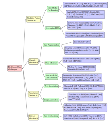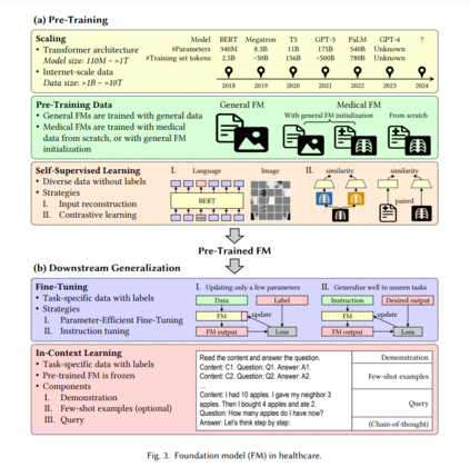 基础模型(FM)分析的增长为医疗应用提供了洞见[208, 295, 321]。我们回顾了解决医疗领域中FM多个方面的关键技术、工具和应用。我们展示了如何将通用目的的FMs应用于医疗领域(第3.1节)。我们介绍了专注于医疗的FMs,并展示了从通用FMs中获得的预训练优势(第3.2节)。