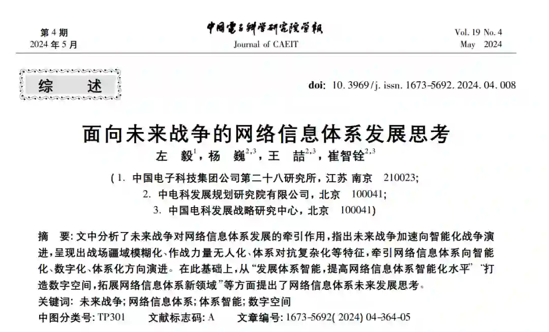 文中分析了未来战争对网络信息体系发展的牵引作用,指出未来战争加速向智能化战争演 进,呈现出战场疆域模糊化、作战力量无人化、体系对抗复杂化等特征,牵引网络信息体系向智能 化、数字化、体系化方向演进。在此基础上,从“发展体系智能,提高网络信息体系智能化水平”“打 造数字空间,拓展网络信息体系新领域”等方面提出了网络信息体系未来发展思考。