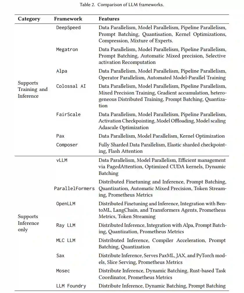 • LLM框架:LLMs的出现促使开发专门的框架,以高效地处理它们的训练、推理和服务。虽然主流的人工智能框架(如TensorFlow、PyTorch和JAX)提供了基础,但它们缺乏对LLMs至关重要的特定优化和特性的内置支持。在第4部分,我们调查了专门为高效LLMs设计的现有框架,介绍了它们的独特特性、底层库和专门化。