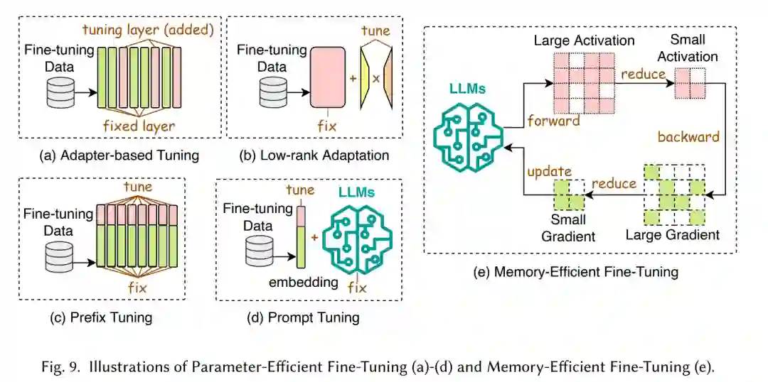 高效微调旨在提高大型语言模型(LLMs)微调过程的效率。正如图8所示,高效微调方法可以分为参数高效微调(PEFT)和内存高效微调(MEFT)。