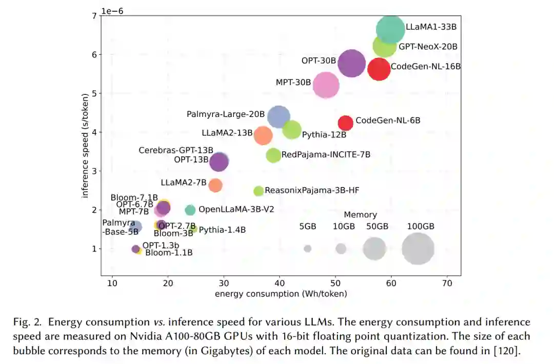 大型语言模型(LLMs)是一种先进的人工智能模型,旨在理解和生成人类语言。最近,我们见证了GPT系列(GPT-3 [21] 和 GPT-4 [197])、谷歌系列(Gemini [266]、GLaM [71]、PaLM [50]、PaLM-2 [8])、Meta系列(LLaMA 1&2 [272, 273])、BLOOM [233]、盘古之心 [227] 和 GLM [339]等LLMs的兴起,以及它们在自然语言理解(NLU)、语言生成、复杂推理[320]和与生物医学[278, 280]、法律[72]及代码生成[34, 300]等领域相关的任务中取得的显著表现。这些性能突破归功于它们的巨大规模,因为它们包含数十亿甚至数万亿个参数,同时又在大量数据上进行训练,这些数据来自多样化的来源。 尽管LLMs引领着人工智能的下一波革命,但LLMs的显著能力却以其巨大的资源需求为代价[50, 71, 197, 227]。图1展示了LLaMA系列模型性能与训练过程中碳排放之间的关系。如图所示,随着模型参数数量的增加,碳排放量呈指数级增长。除了训练之外,推理(inference)也对LLMs的运营成本有着相当大的贡献。如图2所示,更先进的LLMs在推理过程中表现出更高的内存使用和能源消耗,这对于以经济有效的方式将这些模型扩展到更广泛的客户群和多样化的应用中提出了挑战。随着LLMs应用和客户群的快速扩张,推理过程中的运营成本(包括能源消耗和内存使用)将增加,超过训练成本,成为整体环境影响的主导因素。 LLMs的高资源消耗推动了开发技术以提高LLMs效率的需求。本综述的总体目标是提供一个全面的视角,概述高效LLMs的技术进展,并总结现有的研究方向。如图3所示,我们将文献组织成一个由三个主要类别构成的分类法,分别从模型中心、数据中心和框架中心的视角,涵盖了高效LLMs的主题。这三个类别涵盖了不同但相互关联的研究主题,共同提供了对高效LLMs研究的系统性和全面的回顾。具体来说,