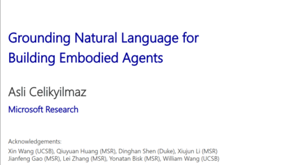 在过去的两年中,语言和视觉交叉领域出现了一些新的任务。其中最受欢迎的是2018年引入的视觉语言导航(VLN)任务。该任务将一个智能体随机放置在家中,并根据自然语言命令指示它们导航到目标目的地。要在这个领域取得成功,需要构建多模态语言地基,允许智能体成功地导航,同时对视觉语言动态进行推理。在MSR中,我们通过结合使用搜索、模仿学习和预训练的方法,显著地推动了这一领域的最新技术。关于VLN之类任务的基本假设是,我们将构建执行命令的智能体。我们训练这些智能体的方法是通过提供观察-操作元组的示例,将其转换为单向语言。我们训练我们的智能体执行我们的命令,但没有必要教智能体如何应对环境中的不确定性。在这个演讲,我将提出我们的最近在强化学习,模仿学习和VLN任务上的预训练方法方面的工作,并将我们的新思路转化为一个更一般的问题,以理解系统如何请求和接受帮助,从而探索视觉语言导航研究领域的技术转移和推广。