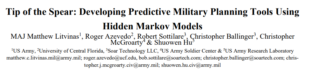 随着新技术的出现,现代战场的演变日益复杂。然而,战场的本质仍然可以用德-约米尼男爵的 “大战术 ”来解释。军事规划者的成功在于他们有能力在战场的决定性时刻,通过复杂系统的分层效应形成协同效应。协同效应需要在规划单元中工作的主题专家(SME)在时间和空间上整合系统和单元。本文探讨了如何应用隐马尔可夫模型(HMMs)来增强现有的兵力与均势相关性(COFM)计算器,将其作为军事规划中的预测工具。目前的工具侧重于用被称为等效因子的标量调整进攻行动的 3 比 1 兵力比。这些工具缺乏识别战场时间和空间物理特性的能力。在计划和训练过程中利用兵棋推演为严肃游戏改进计划工具提供了场所。本研究采用了在 OneSAF 中生成的场景,从简单的排级伏击到以旋翼资产为特色的联合作战机动,这些场景都需要进行塑造以确保有利的 COFM。重点是利用 HMM,使用潜在的可观测数据建立成功概率的时间序列指标,重点是通信动态。在本研究中,我们通过视觉和直接接触产生的数据来研究可观察到的通信。通过观察部队之间的接触,可以预测相对优势在时间和空间上的隐藏状态。通过 OneSAF 模拟生成的数据,HMM 可以确定行动的状态和成功概率,同时最大限度地减少单元内部所需的存在。