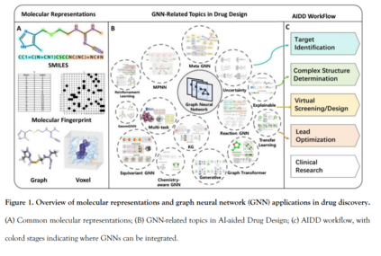 因此,图表示正在逐渐成为分子建模中的主流。GNN 已被制药巨头(如 Roche、Novartis)、AI 生物技术初创公司(如 BenevolentAI、Insilico Medicine)及开放数据集支持的研究社区(如 OGB-Mol【18】与 GEOM【19】)广泛采纳。这些发展不仅反映了 GNN 在 AIDD 中的核心地位,也表明了对面向多样生物医学任务的专用 GNN 架构日益增长的需求。
